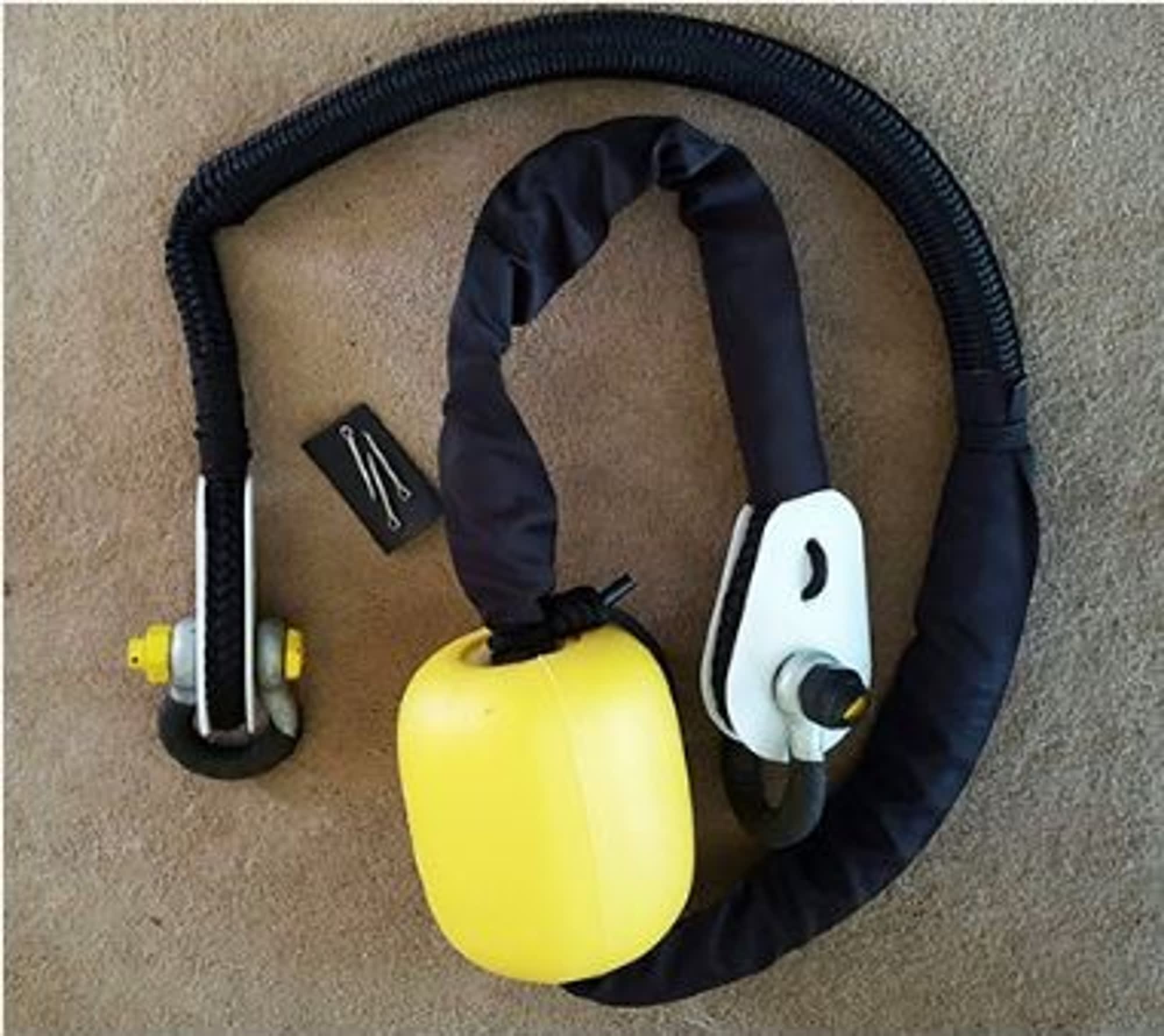 Above is an example of our custom wye shaped pennant, spliced in house. We use USA made line, all stainless hardware. All splices are load tested to 2000 lbs and then whipped closed. The cordura chafe sleeve is custom sized to your boat and whipped into position. An additional 1 foot piece of cordura chafe is included which can be moved to the exact area of the chock or other chafe points. 3" toggle floats keep the body of the pennant from getting caught under the ball and chain. The integrated stainless steel jaw to eye swivel allows any twists in the mooring system to unwind before damaging the pennant line. Tie down lines secure the loop splices and keep your pennant tight to your cleat. This modular design of locking spliced loops allows you to have independent arms, to if one fails you have an additional one for back up. The arms are able to be replaced separately if one should get damage without any re-splicing.