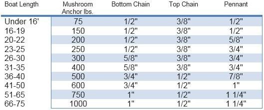 The city of Newport only allows the use of Mushroom and Pyramid Anchors. Listed below are the minimum mooring regulations. Always consider going with a least one size up where possible.